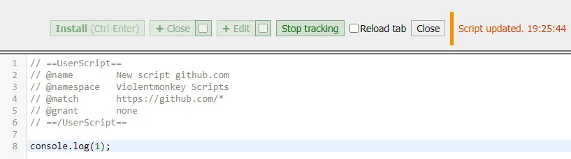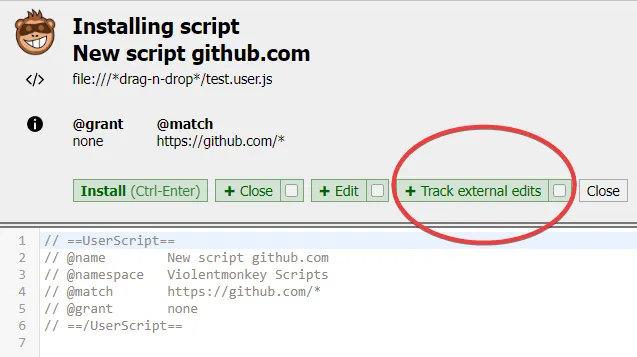 ⚡ Simply open the local .user.js file in Violentmonkey and enable tracking, so each time you save the file in your external editor the changes are automatically incorporated.